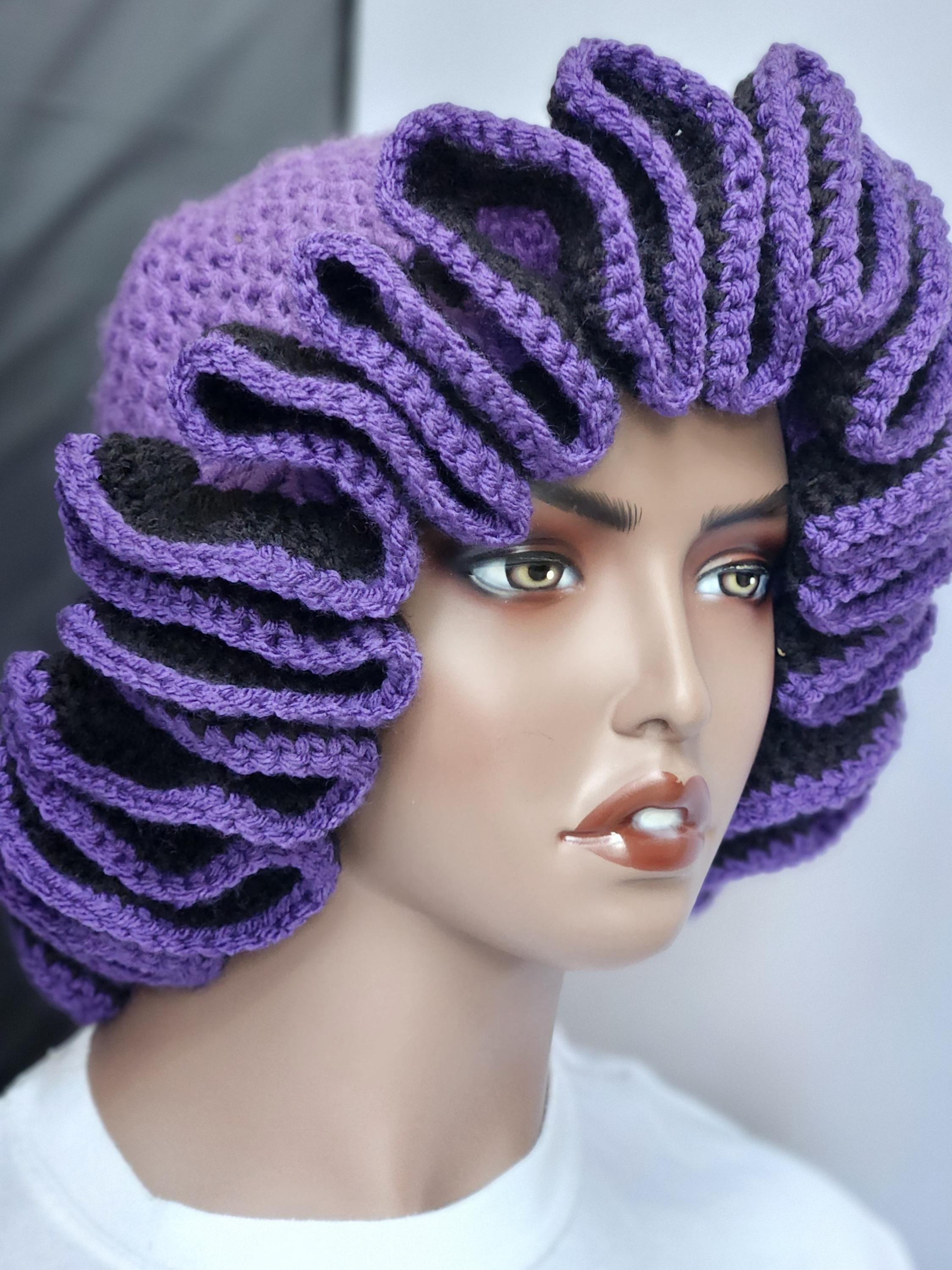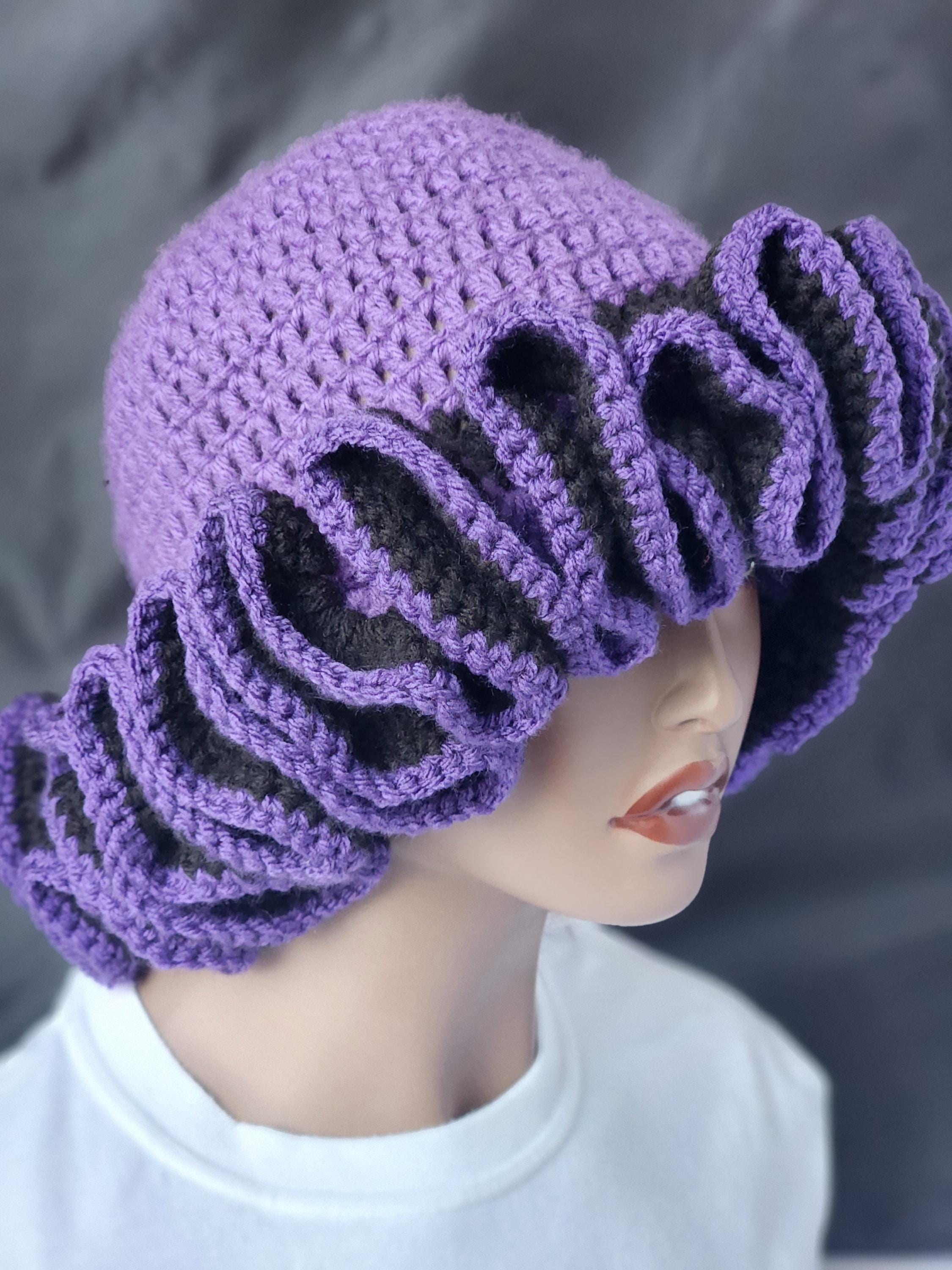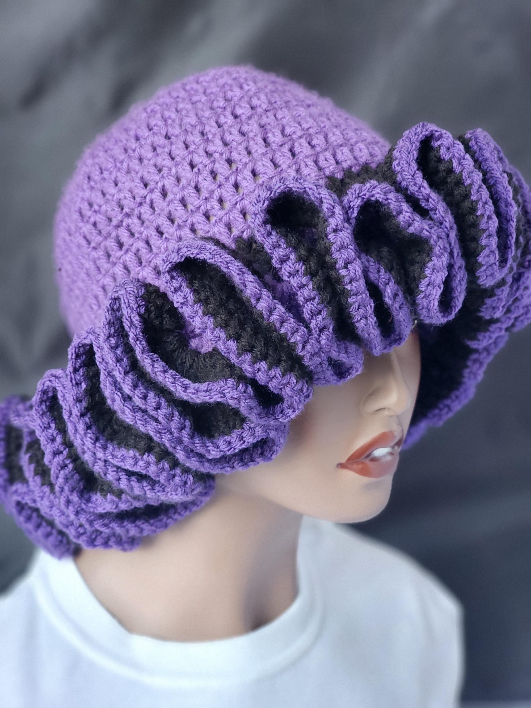Purple and Black Handmade Crochet Ruffle Bucket Hat - Stylish Women Everyday Headwear.