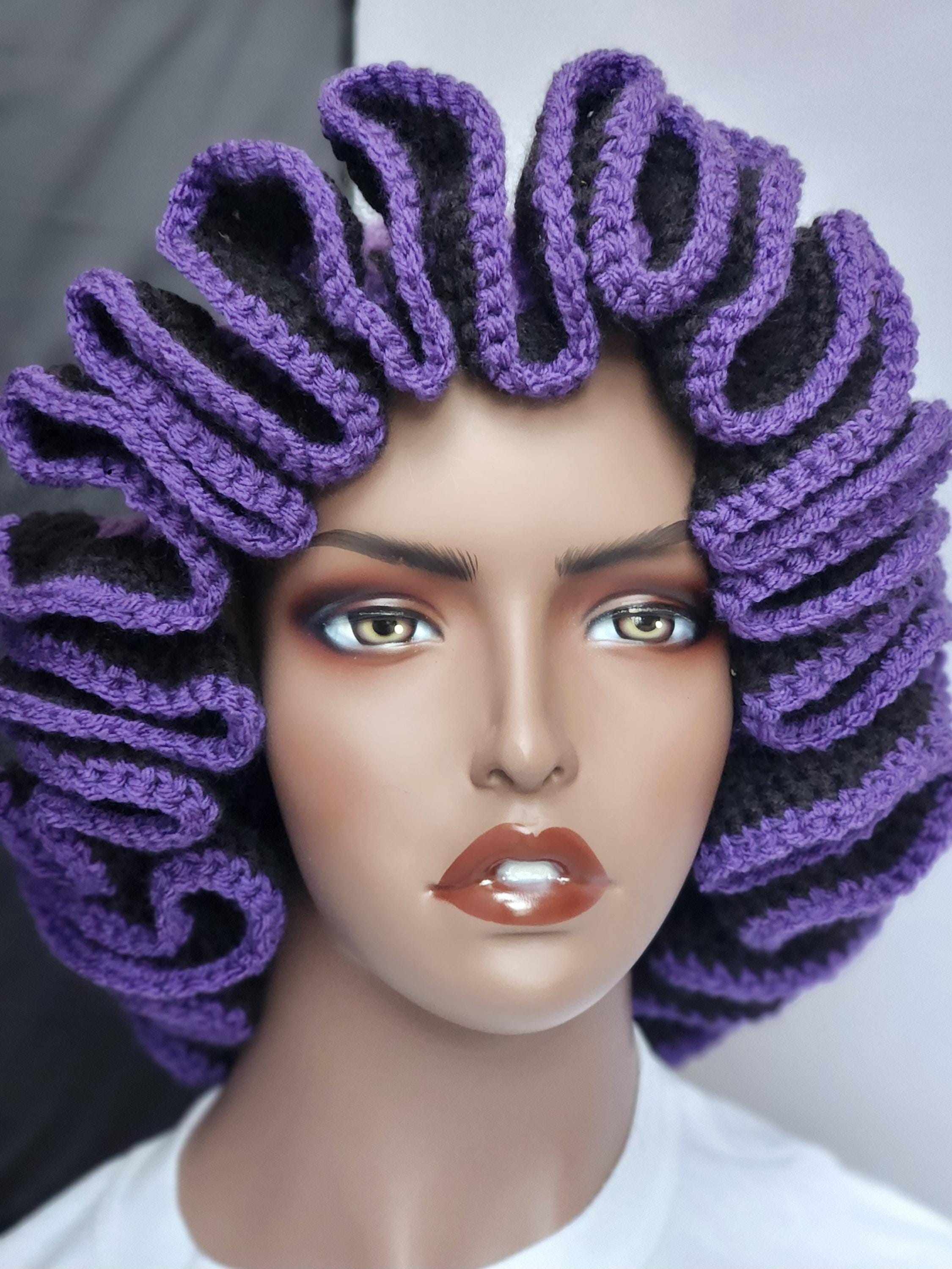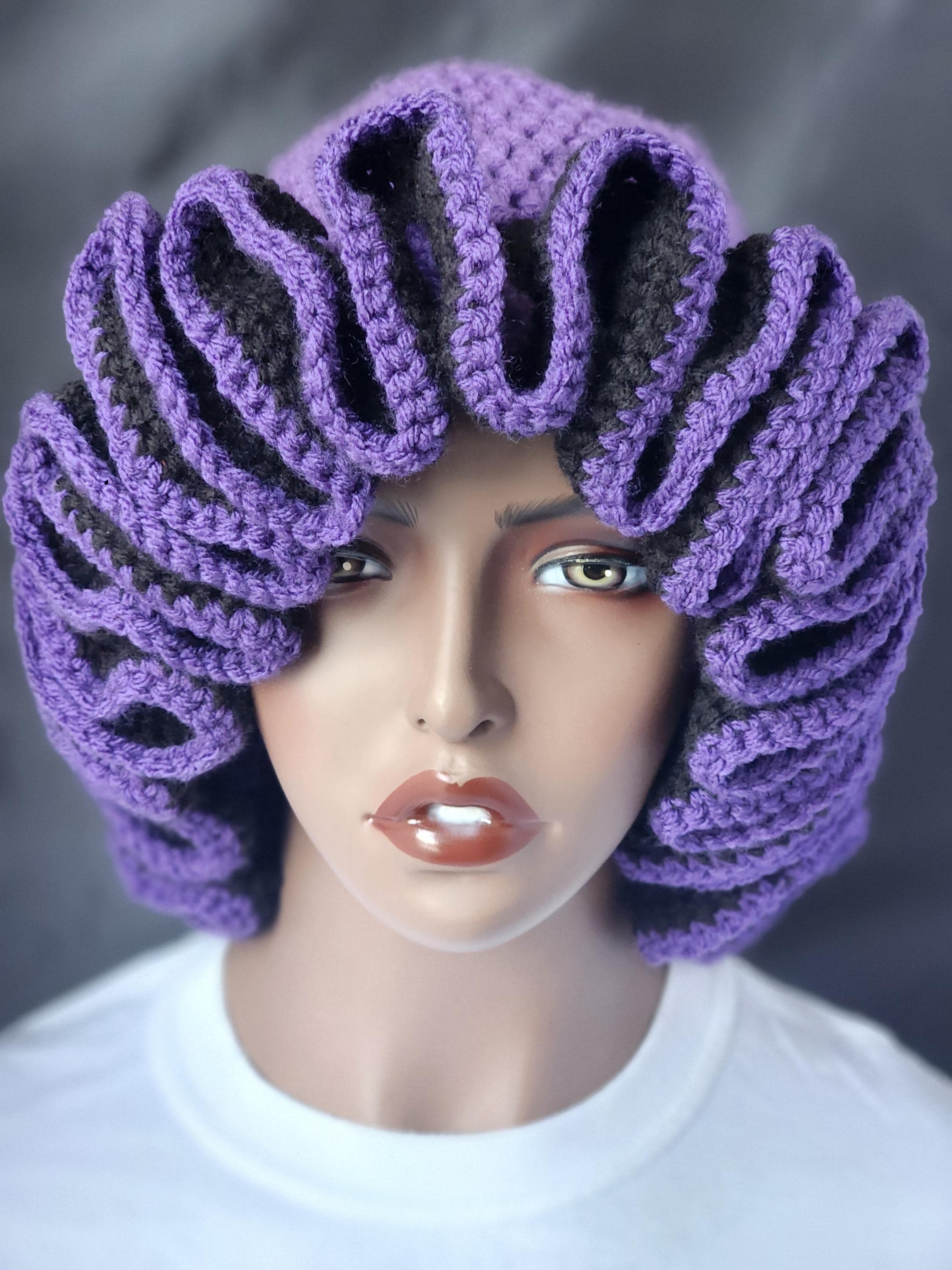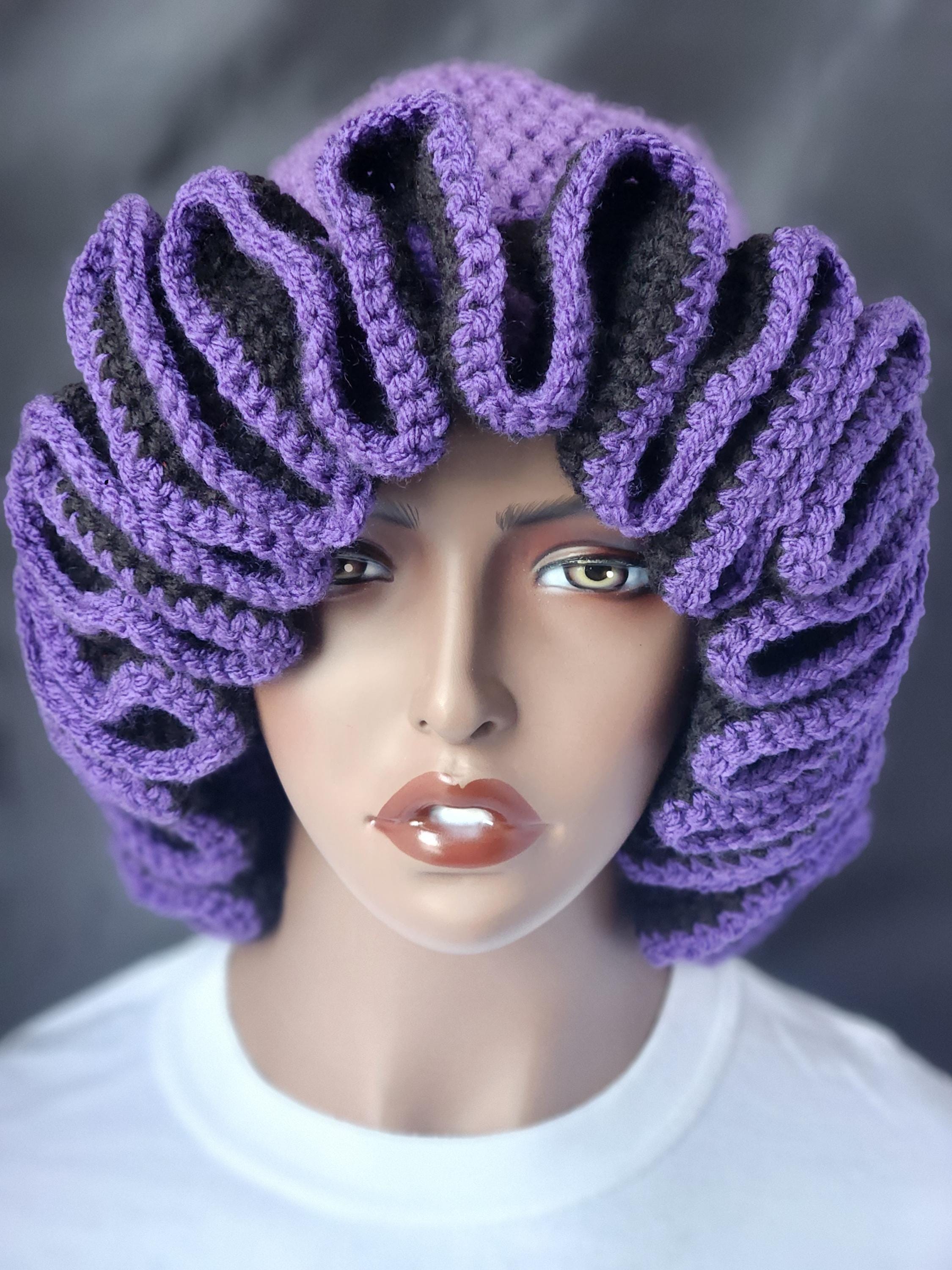 Purple and Black Handmade Crochet Ruffle Bucket Hat - Stylish Women Everyday Headwear.